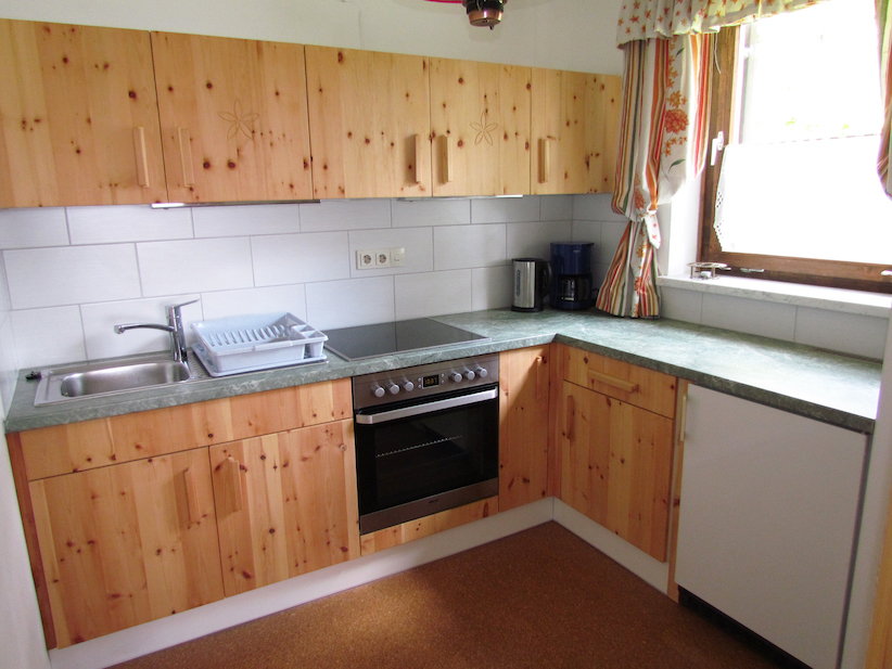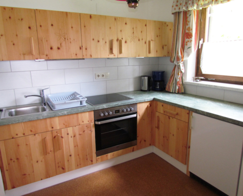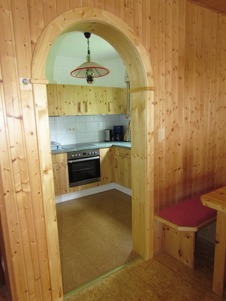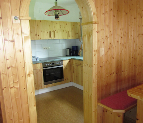 - voll ausgestattete Zirben-Küche mit Ceran-Kochfeld, Backrohr, Kühlschrank inkl. Gefrierfach, Kaffeemaschine, Wasserkocher, Toaster