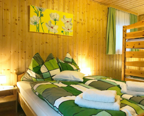 - 1 Schlafzimmer mit französischem Doppelbett (140×200) und Etagenbett (Platz für bis zu 4 Personen)